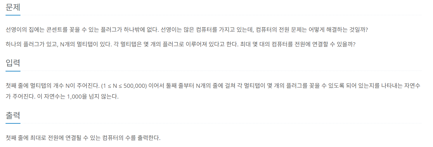첫째 줄에 멀티탭의 개수 N이 주어진다. (1 ≤ N ≤ 500,000) 이어서 둘째 줄부터 N개의 줄에 걸쳐 각 멀티탭이 몇 개의 플러그를 꽂을 수 있도록 되어 있는지를 나타내는 자연수가 주어진다. 이 자연