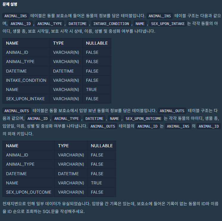 그 때 보호소에 들어온 기록이 없는 동물들의 조건을 IS NULL을 통해 구한다.