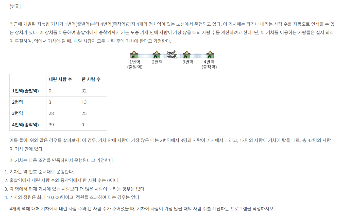 최근에 개발된 지능형 기차가 1번역(출발역)부터 4번역(종착역)까지 4개의 정차역이 있는 노선에서 운행되고 있다. 이 기차에는 타거나 내리는 사람 수를 자동으로 인식할 수 있는 장치가 있다.