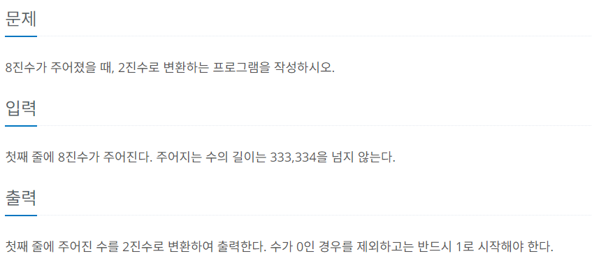 첫째 줄에 8진수가 주어진다. 주어지는 수의 길이는 333,334을 넘지 않는다.