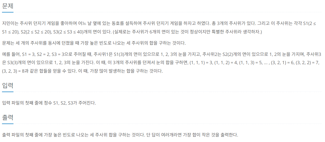 지민이는 주사위 던지기 게임을 좋아하여 어느 날 옆에 있는 동호를 설득하여 주사위 던지기 게임을 하자고 하였다. 총 3개의 주사위가 있다. 그리고 이 주사위는 각각 S1(2 ≤ S1 ≤ 20), S2(2 ≤ S2
