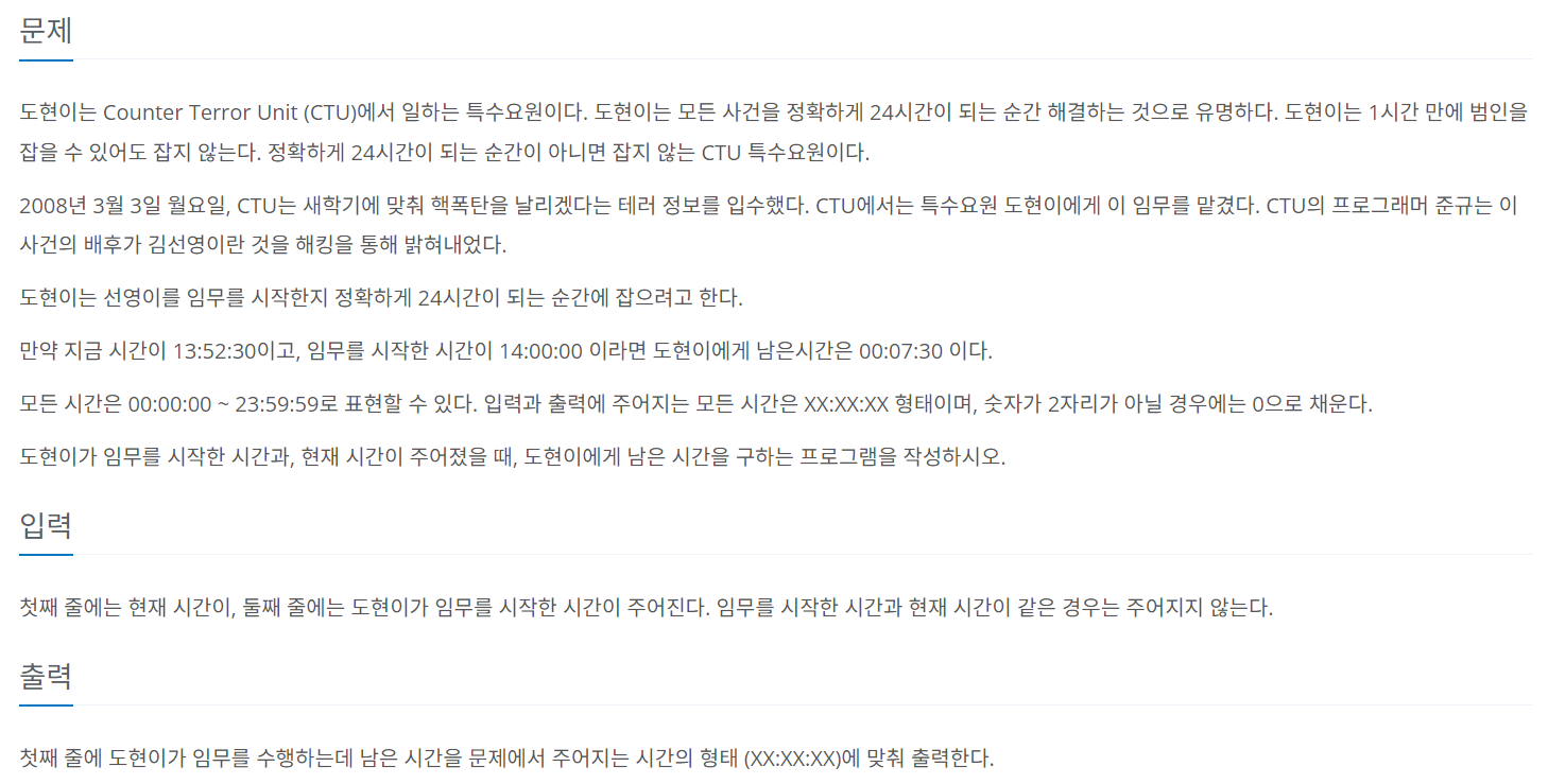 도현이는 Counter Terror Unit (CTU)에서 일하는 특수요원이다. 도현이는 모든 사건을 정확하게 24시간이 되는 순간 해결하는 것으로 유명하다. 도현이는 1시간 만에 범인을 잡을 수 있어도 잡지 않는
