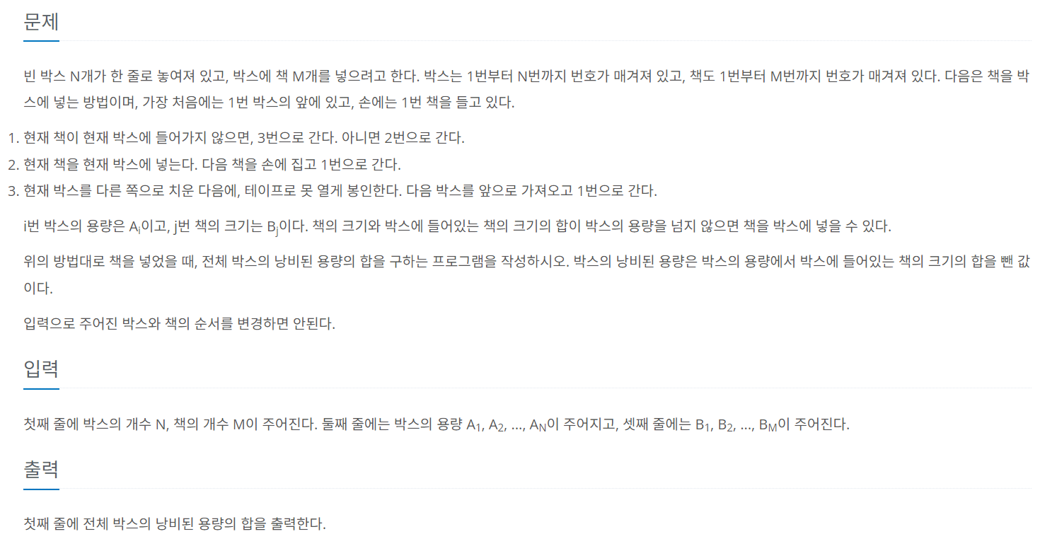 첫째 줄에 박스의 개수 N, 책의 개수 M이 주어진다. 둘째 줄에는 박스의 용량 A1, A2, ..., AN이 주어지고, 셋째 줄에는 B1, B2, ..., BM이 주어진다.